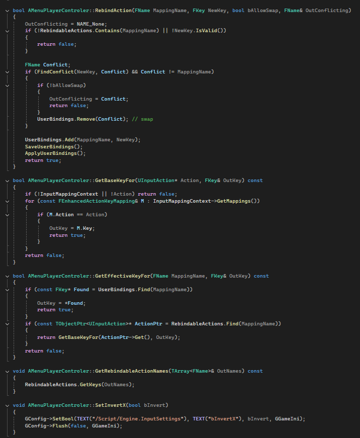 To fix this, I made the widget controller-agnostic, so it can talk to either ANitroPlayerController or AMenuPlayerController. I extended the Menu controller with the same rebind API as the in-game controller (RebindAction, GetEffectiveFor, GetRebinableActionNames), and ensured it loaded/saved user overrides to the same config file. Finally, I moved the label assignment in URebindRowWidget to SynchronizeProperties() so the action name would always display correctly.